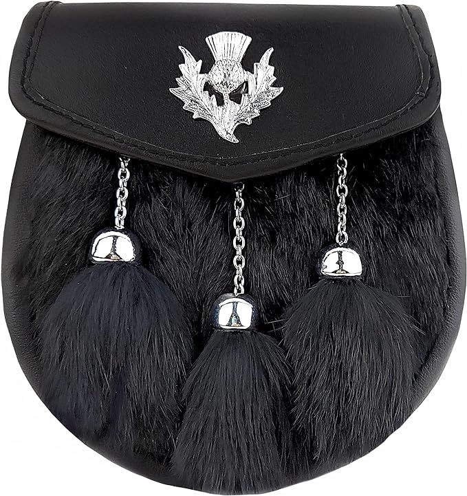 FULL DRESS KILT SPORRAN WHITE & BLACK RABBIT FUR, THISTLE BADGE, CHROME CELTIC CANTLE WITH THISTLE FOR MEN STRZ-011